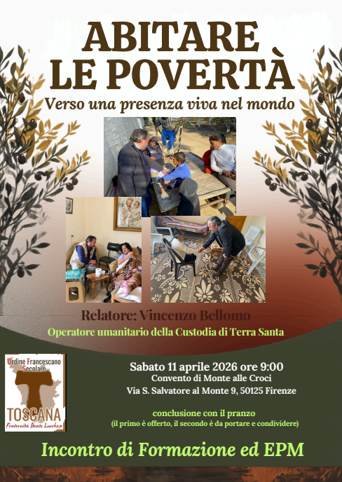 Come da titolo, sabato 11 aprile si terrà un momento di incontro dal titolo “ABITARE LE POVERTA'” a cura del nostro OFS regionale “Beato Lucchese”.